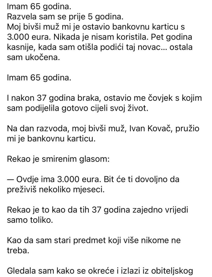 Izvadio sam ga iz ladice u kojoj sam ga godinama čuvao. Bilo je netaknuto. Kao da vrijeme za nju nije prošlo…iako za mene jest. Ruke su mi drhtale. Nisam znao je li to iz slabosti… ili zbog svega što je ta karta predstavljala. Prošetao sam do najbližeg bankomata bolnici. Zvuk stroja činio mi se zaglušujućim […]