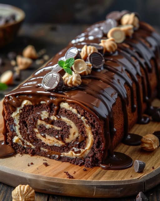 1. Odmotaš ohlađeni biskvit, premažeš ga filom. 2. Pažljivo zarolaj nazad (bez krpe) i položi na tacnu spojem prema dolje. 3. Prelij čokoladnom glazurom, pusti da se sliva niz stranice. Ukrasi mini čokoladicama s kikiriki puterom. 4. Ohladi najmanje 1 sat prije rezanja i posluživanja.