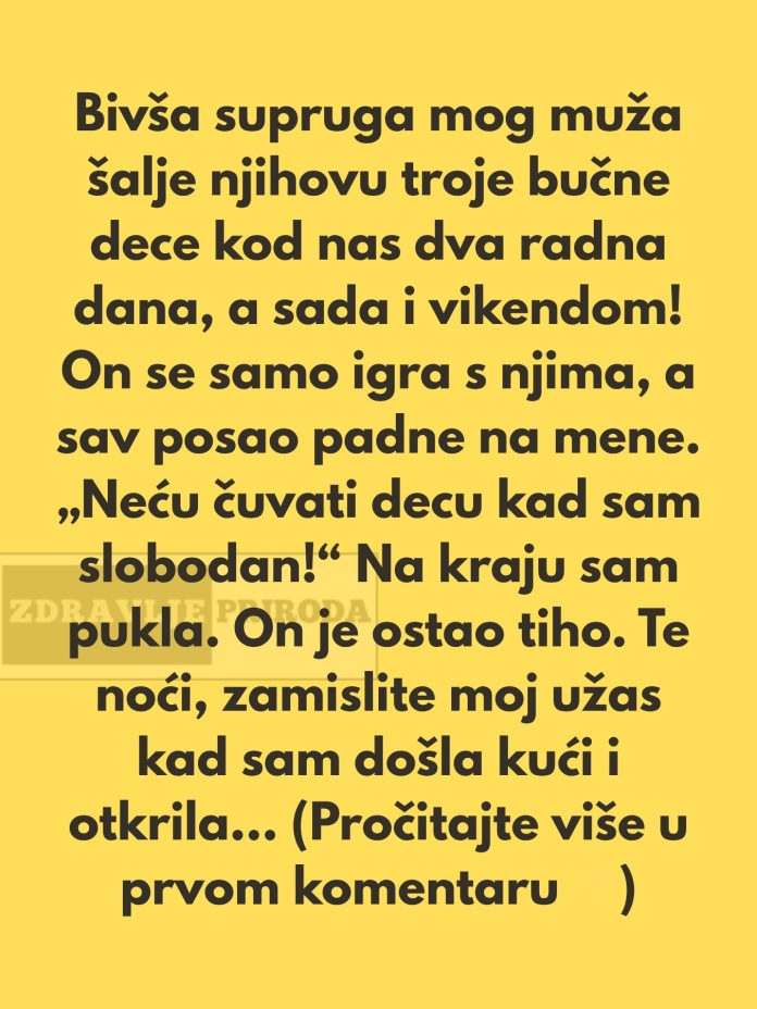 Bivša supruga mog muža šalje njihovu troje bučne dece kod nas dva radna dana, a sada i vikendom! On se samo igra s njima, a sav posao padne na mene. „Neću čuvati decu kad sam slobodan!“