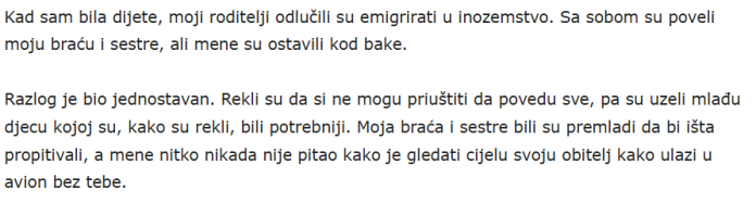 Kad sam bila dijete, moji roditelji odlučili su emigrirati u inozemstvo. Sa sobom su poveli moju braću i sestre, ali mene su ostavili kod bake.