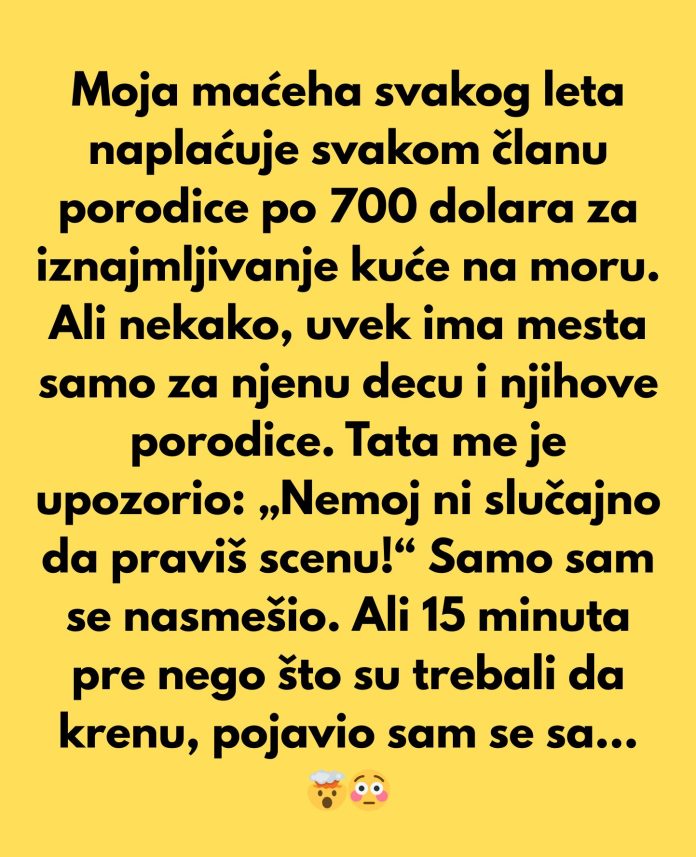 Svako leto moja maćeha od svakog od nas uzima po 700 dolara za iznajmljivanje kuće na moru. Ali nekako, uvek ima dovoljno mesta samo za njenu decu i njihove porodice. Svake godine dobijem istu rečenicu: „Nije bilo dovoljno prostora — možda sledeći put.“ Kada sam to pomenula, tata me je upozorio: „Nemoj ni slučajno da praviš scenu.“ Nasmejala sam se, složila i predala svojih 700 dolara, kao i obično.