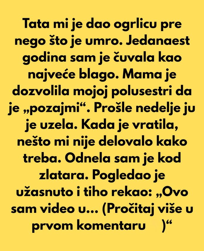 Zovem se „Mia“ (17F). Kada sam imala 6 godina, moj tata je preminuo od raka. Poslednje što mi je ikada dao bila je nežna zlatna ogrlica sa malim, pravim safirom u sredini. To nije samo nakit; to je jedini fizički predmet koji mi je ostao od njega. Nosila sam je ili čuvala u baršunastoj kutiji ispod kreveta 11 godina.