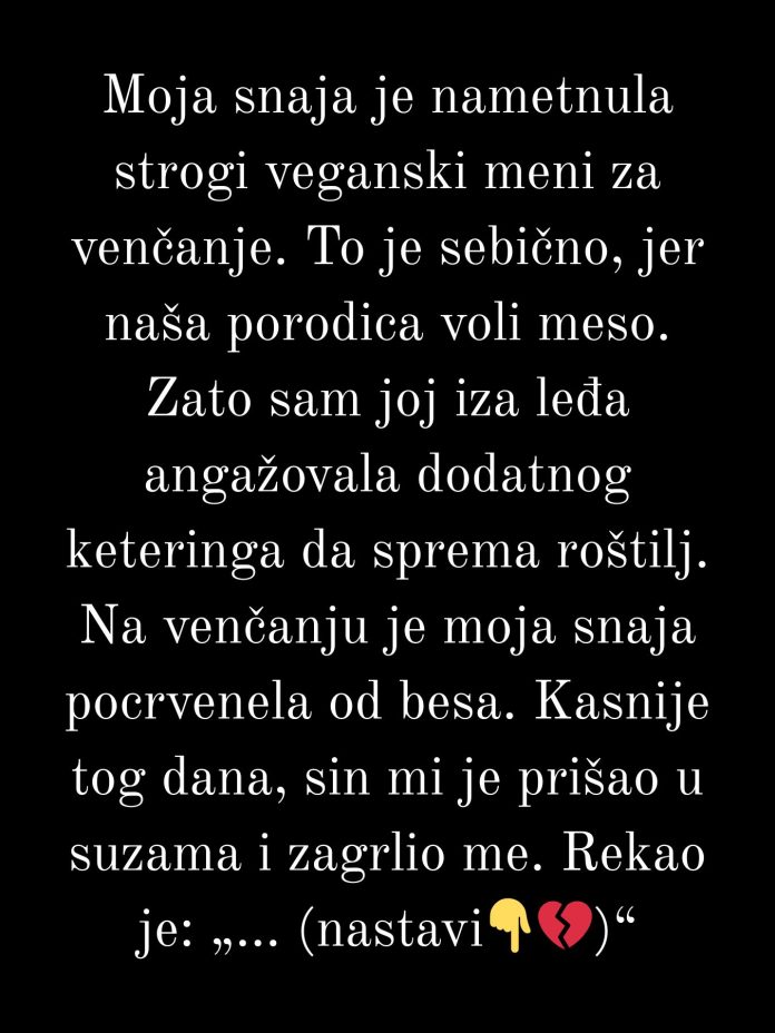 Mislim da je to jako sebično s njene strane, s obzirom na to da naša strana porodice voli meso. Zato sam joj iza leđa angažovala dodatnog keteringa da pripremi šnicле i roštilj, jer sam željela da se svi dobro provedu.