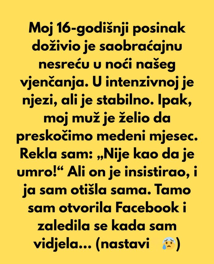 Moj 16-godišnji posinak doživio je saobraćajnu nesreću u noći našeg vjenčanja. Nalazi se na intenzivnoj njezi, ali je stabilno. Ipak, moj muž je želio da preskočimo medeni mjesec. Rekla sam: „Nije kao da je umro!“ Ali on je insistirao i ja sam otišla sama.