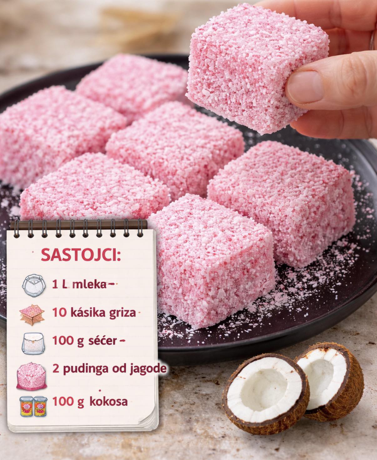 Kada se kolač dobro ohladi i učvrsti, izvadi ga iz pleha, isijeci na kocke željene veličine i svaku kocku uvaljaj u kokos, koji će mu dati dodatnu aromu i ljepši izgled.