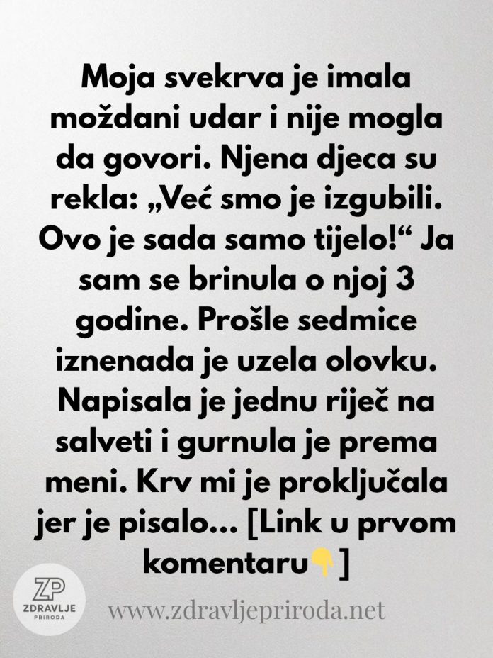 Moja svekrva je imala moždani udar i nije mogla da govori. Njena djeca su rekla: „Već smo je izgubili. Ovo je sada samo tijelo!“ Ja sam se brinula o njoj 3 godine.