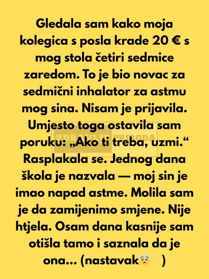 Četiri sedmice zaredom moja kolegica je uzimala 20 dolara iz ladice mog stola. To nije bio sitniš. Svakog petka taj novac sam ostavljala sa strane za lijek protiv astme za mog sina. Ista ladica. Ista koverta.