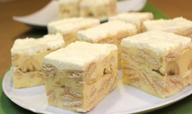 U lim srednje veličine premazan tankim slojem maslaca izliti polovicu smjese, preko toga složiti banane prerezane po dužini jednu uz drugu, prekriti ostatkom smjese i pustiti da se ohladi i stisne.