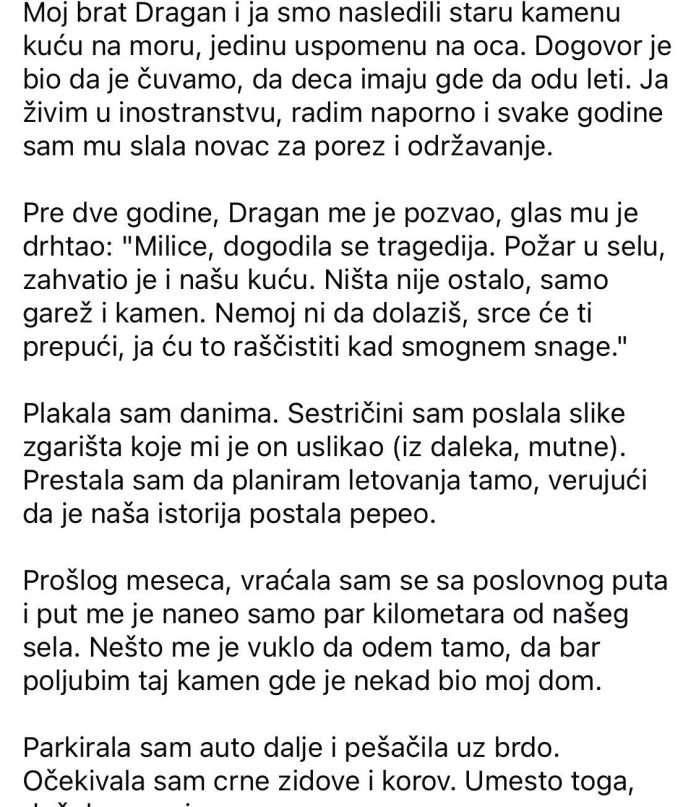 Moj brat Dragan i ja smo nasledili staru kamenu kuću na moru, jedinu uspomenu na oca. Dogovor je bio da je čuvamo, da deca imaju gde da odu leti. Ja živim u inostranstvu, radim naporno i svake godine sam mu slala novac za porez i održavanje. Pre dve godine, Dragan me je pozvao, glas mu je drhtao: “Milice, dogodila se tragedija. Požar u selu, zahvatio je i našu kuću. Ništa nije ostalo, samo garež i kamen. Nemoj ni da dolaziš, srce će ti prepući, ja ću to raščistiti kad smognem snage.” Plakala sam danima. Sestričini sam poslala slike zgarišta koje mi je on uslikao (iz daleka, mutne). Prestala sam da planiram letovanja tamo, verujući da je naša istorija postala pepeo.