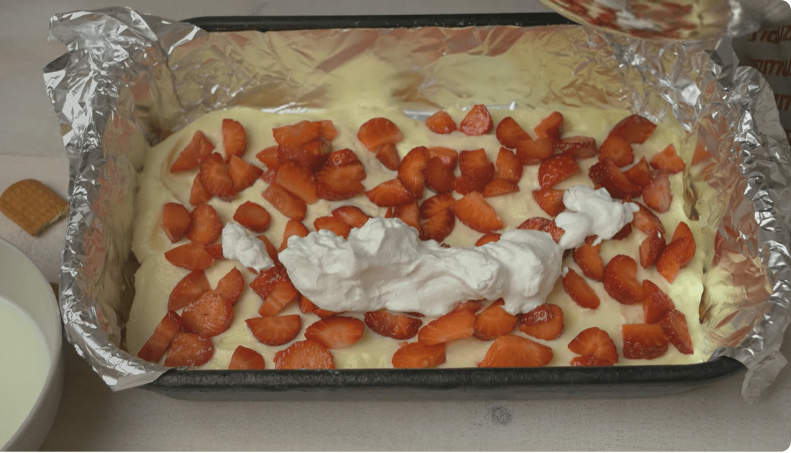 Na kekse premazati sloj fila, pokriti seckanim jagodama i premazati slatkom pavlakom.