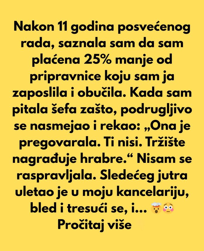 Nakon 11 godina posvećenog rada kao stariji projekt menadžer, otkrio sam da zarađujem 25% manje od početnice koju sam lično zaposlio i obučio. Kada sam se suočio sa šefom, podrugljivo se nasmešio i rekao: „Ona je pregovarala. Ti nisi. Tržište nagrađuje hrabre.“ Nisam se raspravljao. Sledećeg jutra stigao sam u kancelariju pre svih i tiho […]
