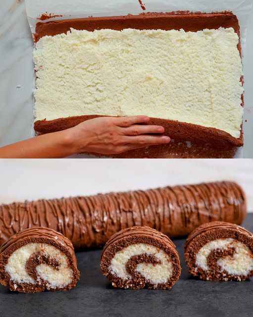 Ohladi 5–10 minuta. - Odmotaj biskvit, premaži toplim kokos kremom, pa ponovo pažljivo urolaj.