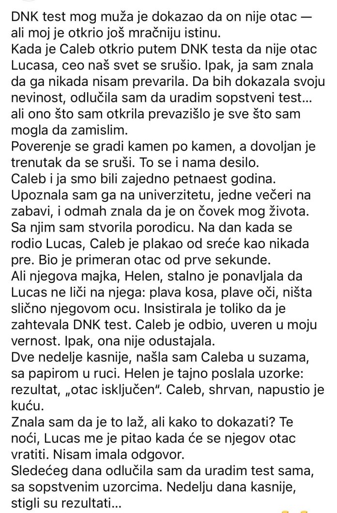 Ali njegova majka, Helen, stalno je ponavljala da Lucas ne liči na njega: plava kosa, plave oči, ništa sa ocem. Toliko je insistirala da je na kraju zahtevala DNK test. Caleb je odbio, uveren u moju vernost. Ipak, nije odustajala.