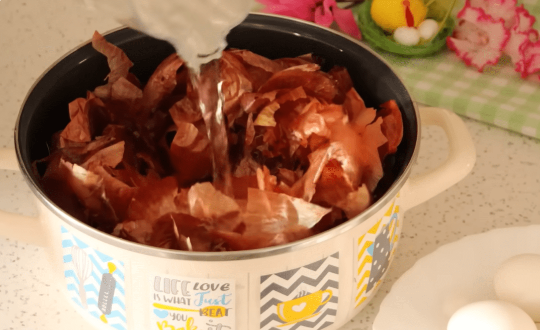 Ljuske luka je najbolje sakupljati nekoliko dana unaprijed kako biste imali dovoljnu količinu. Stavite ih u šerpu, dodajte vodu i sirće, pa kuhajte oko 15 minuta. Tokom kuhanja voda će poprimiti tamnu, crvenkasto-smeđu boju, što znači da je boja spremna.