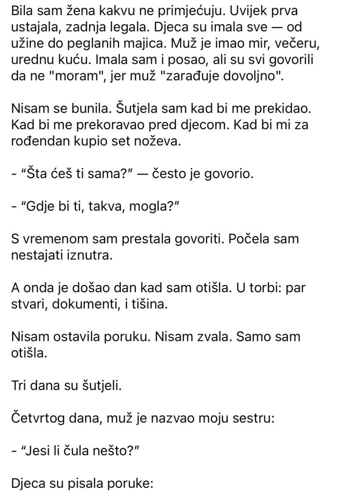 Bila sam žena kakvu ne primjećuju. Uvijek prva ustajala, zadnja legala. Djeca su imala sve — od užine do peglanih majica. Muž je imao mir, večeru, urednu kuću. Imala sam i posao, ali su svi govorili da ne “moram”, jer muž “zarađuje dovoljno”. Nisam se bunila. Šutjela sam kad bi me prekidao. Kad bi me prekoravao pred djecom. Kad bi mi za rođendan kupio set noževa. – “Šta ćeš ti sama?” — često je govorio. – “Gdje bi ti, takva, mogla?” S vremenom sam prestala govoriti. Počela sam nestajati iznutra. A onda je došao dan kad sam otišla. U torbi: par stvari, dokumenti, i tišina. Nisam ostavila poruku. Nisam zvala. Samo sam otišla. Tri dana su šutjeli.