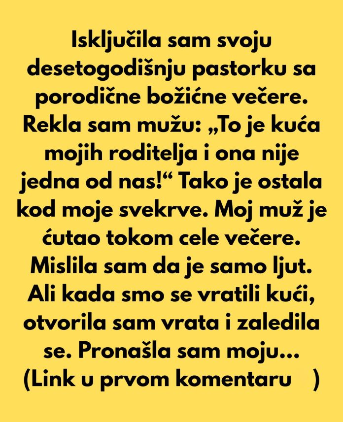 Isključila sam svoju desetogodišnju pastorku sa porodične božićne večere. Rekla sam mužu: „To je kuća mojih roditelja i ona nije jedna od nas!“ Tako je ostala kod kuće, a zamolili smo moju svekrvu da dođe i pazi na nju.