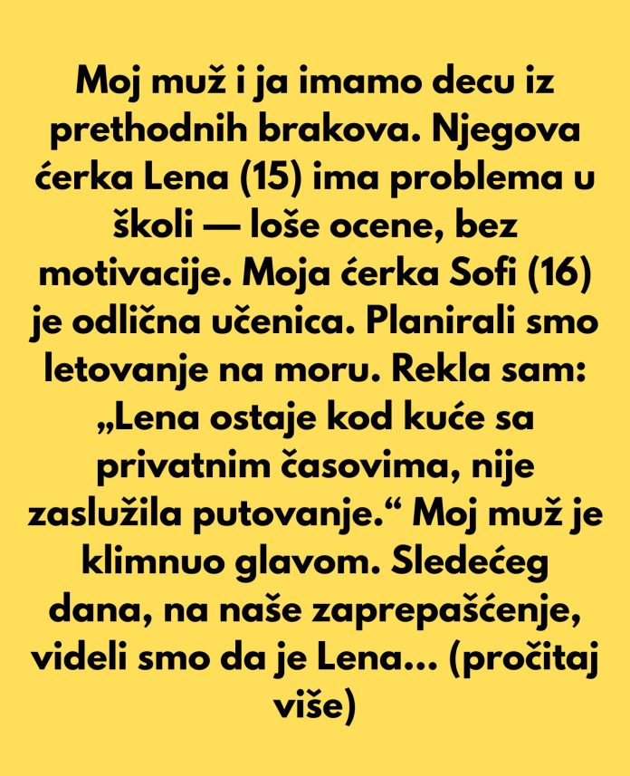 Ovog leta smo planirali letovanje na moru. Karte kupljene, hotel plaćen. Ali kako su Lenine ocene nastavile da padaju, donela sam tešku odluku. Rekla sam joj da neće ići sa nama. Umesto toga, ostaće kod kuće, fokusirati se na školske obaveze i raditi sa privatnim tutorom kog sam platila iz svog džepa. Iskreno sam mislila da joj je to poziv na buđenje koji joj je bio potreban. Njen otac se nije bunio. Samo je klimnuo glavom i rekao: „Možda je tako najbolje.“