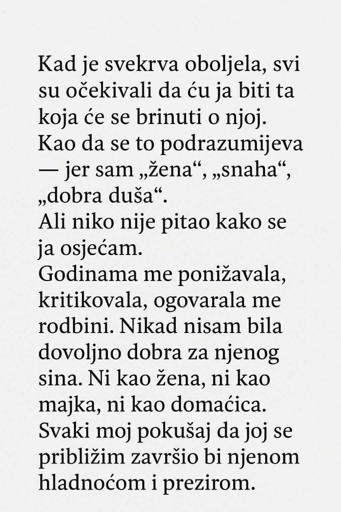 Kad je svekrva oboljela, svi su očekivali da ću ja biti ta koja će se brinuti o njoj.