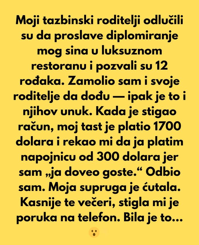 Moji tazbinski roditelji pozvali su 12 rođaka u luksuzni restoran povodom diplomiranja mog sina. Zamolio sam i svoje roditelje da dođu, jer smo slavili njihovog unuka. Kada je stigao račun, moj tast je platio 1700 dolara i zamolio me da ja platim napojnicu od 18% jer sam, kako je rekao, „ja doveo goste“. Odbio sam i otišao. Moja supruga je ćutala.