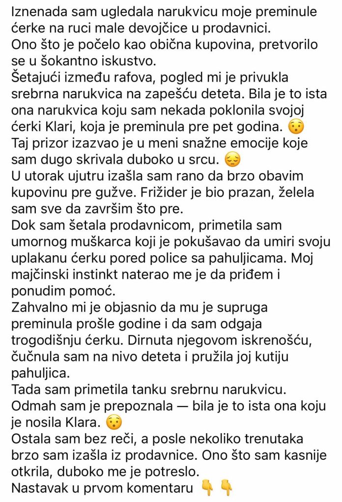 Šetala sam između polica, žureći da završim kupovinu pre nego što naiđe gužva, kada je moj pogled slučajno pao na srebrnu narukvicu na ruci male devojčice. To je bila potpuno ista narukvica kakvu sam nekada poklonila svojoj ćerki Klari — ćerki koju sam izgubila pre pet godina.