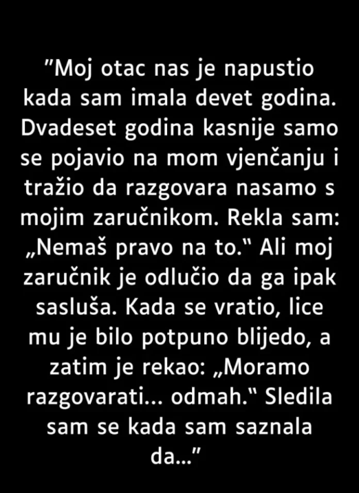 Rekao sam: „Nemaš pravo na to.“ Ali moj zaručnik ga je ipak saslušao. Kada se vratio, lice mu je bilo blijedo, a zatim je rekao: „Moramo razgovarati… odmah.“