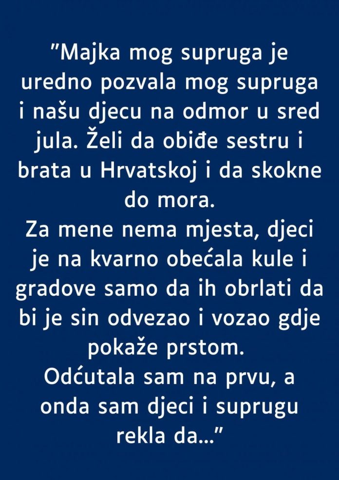 “Majka mog supruga je uredno pozvala mog supruga i našu djecu na odmor u sred jula. Želi da obiđe sestru i brata u Hrvatskoj i da skokne do mora.