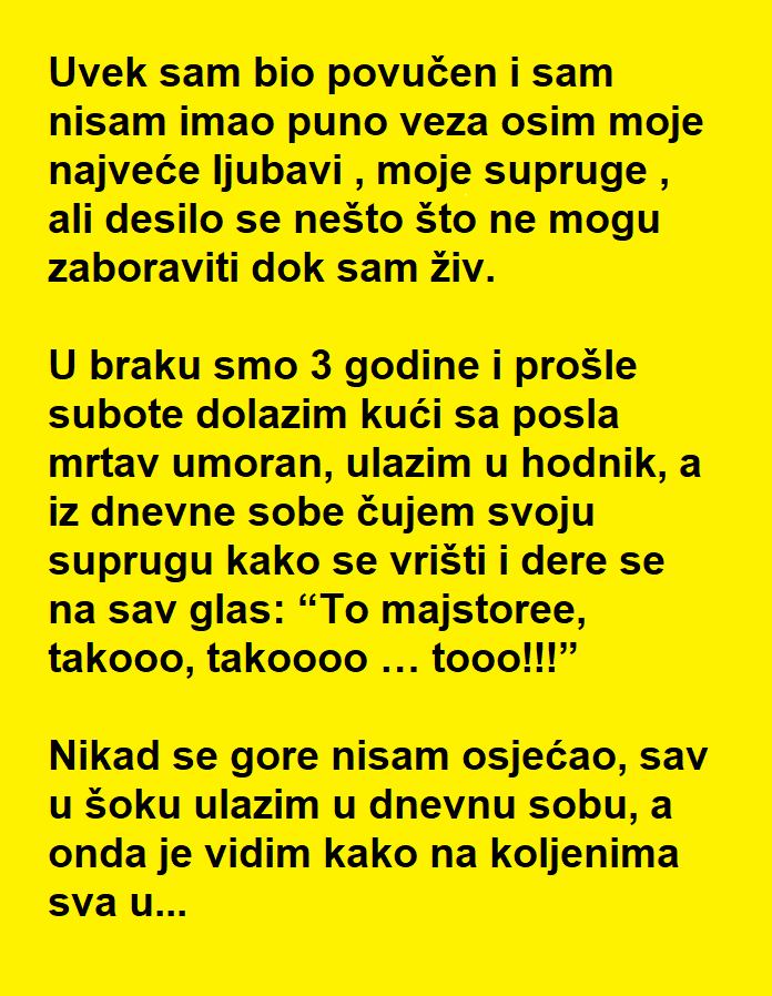 U braku smo 3 godine i prošle subote dolazim kući sa posla mrtav umoran, ulazim u hodnik, a iz dnevne sobe čujem svoju suprugu kako se vrišti i dere se na sav glas: “To majstoree, takooo, takoooo … tooo!!!”