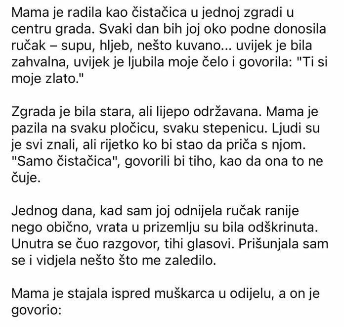 Mama je radila kao čistačica u jednoj zgradi u centru grada. Svaki dan bih joj oko podne donosila ručak – supu, hljeb, nešto kuvano… uvijek je bila zahvalna, uvijek je ljubila moje čelo i govorila: “Ti si moje zlato.”