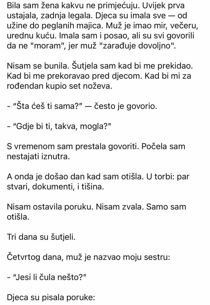Bila sam žena kakvu ne primjećuju. Uvijek prva ustajala, zadnja legala. Djeca su imala sve — od užine do peglanih majica. Muž je imao mir, večeru, urednu kuću. Imala sam i posao, ali su svi govorili da ne “moram”, jer muž “zarađuje dovoljno”.