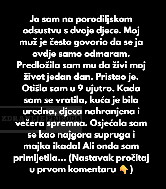 Otišla sam u 9 ujutro. Kada sam se vratila, kuća je bila uredna, djeca nahranjena i večera spremna. Osjećala sam se kao najgora supruga i majka ikada!