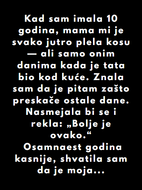 Kad sam imala 10 godina, mama mi je svako jutro plela kosu — ali samo onim danima kada je tata bio kod kuće. Znala sam da je pitam zašto preskače ostale dane. Ona bi se samo nasmešila i rekla: „Bolje je ovako.“