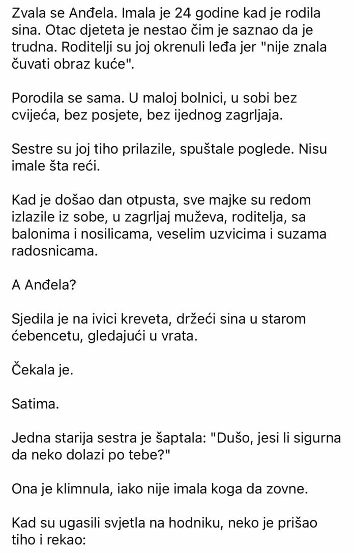 Zvala se Anđela. Imala je 24 godine kad je rodila sina. Otac djeteta je nestao čim je saznao da je trudna. Roditelji su joj okrenuli leđa jer “nije znala čuvati obraz kuće”.