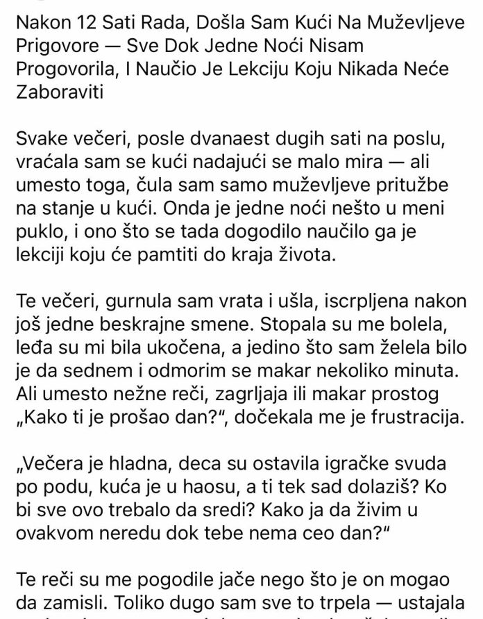 Posle dvanaest sati na poslu, iscrpljena, s bolovima u leđima i mislima punim briga, ona je konačno stigla kući. Sanjala je o samo nekoliko minuta tišine — o toplom tušu, možda šolji čaja, i miru. Ali čim su se vrata zatvorila za njom, umesto pozdrava i razumevanja, dočekale su je reči koje su bolela više od umora.