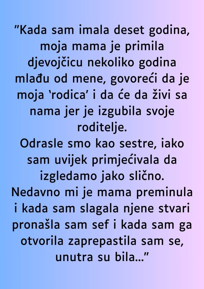 Nedavno mi je mama preminula i kada sam slagala njene stvari pronašla sam sef i kada sam ga otvorila zaprepastila sam se, unutra su bila pisma koja su otkrila da je ta ‘rođaka’ zapravo moja polusestra – moja mama ju je skrivala od porodice, posramljena zbog afere koja ju je dovela na svijet.
