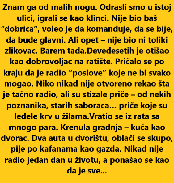 Znam ga od malih nogu. Odrasli smo u istoj ulici, igrali se kao klinci. Nije bio baš “dobrica”, voleo je da komanduje, da se bije, da bude glavni. Ali opet – nije bio ni toliki zlikovac. Barem tada.Devedesetih je otišao kao dobrovoljac na ratište. Pričalo se po kraju da je radio “poslove” koje ne bi svako mogao. Niko nikad nije otvoreno rekao šta je tačno radio, ali su stizale priče – od nekih poznanika, starih saboraca… priče koje su ledele krv u žilama.Vratio se iz rata sa mnogo para. Krenula gradnja – kuća kao dvorac. Dva auta u dvorištu, oblači se skupo, pije po kafanama kao gazda. Nikad nije radio jedan dan u životu, a ponašao se kao da je sve pošteno stekao. I niko mu ništa ne govori – znaš kako to već ide, “bolje ne talasaj”.