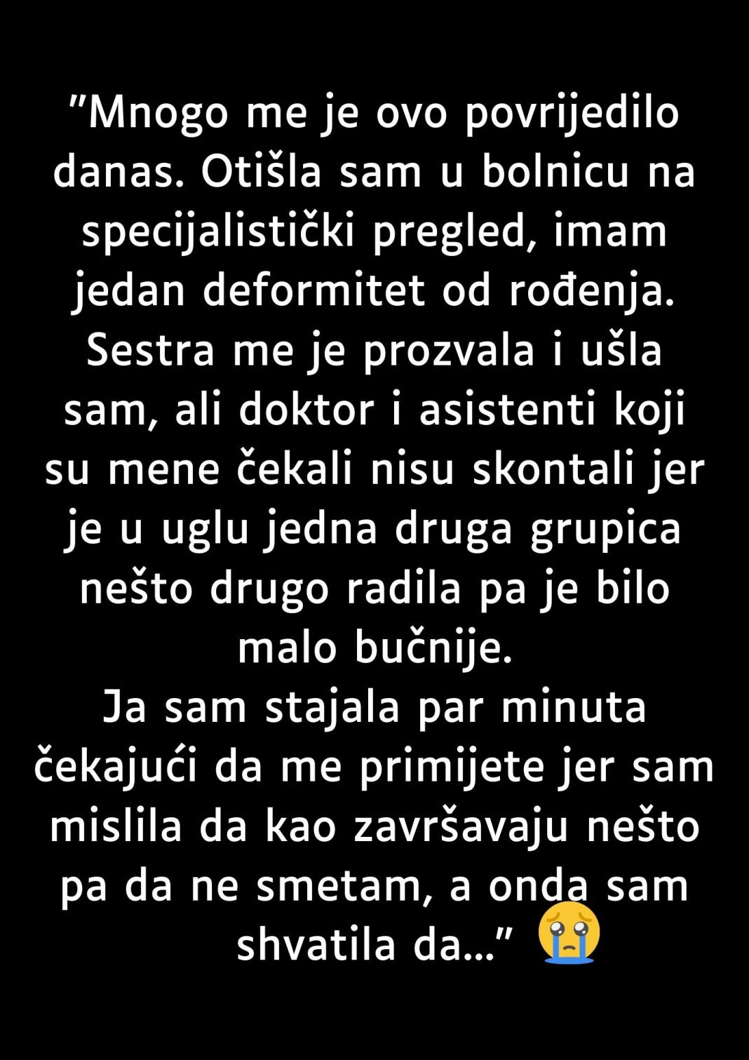 “Mnogo me je ovo povrijedilo danas. Otišla sam u bolnicu na specijalistički pregled, imam jedan deformitet od rođenja.