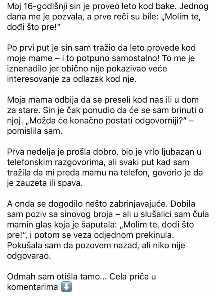 Moj šesnaestogodišnji sin je trebalo da provede leto kod moje majke, svoje bake. Ideja je delovala divno: svež vazduh, uredno dvorište, domaće kolače, mirne večeri na verandi. Mislila sam da će mu to pomoći da se odmori od gradskog žamora, nauči da ceni jednostavne radosti i možda malo odraste.