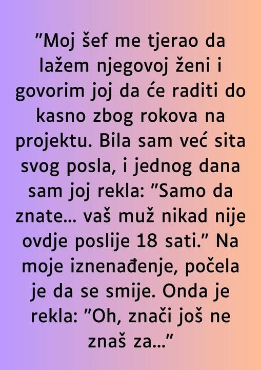 “Moj šef me tjerao da lažem njegovoj ženi i govorim joj da će raditi do kasno zbog rokova na projektu.