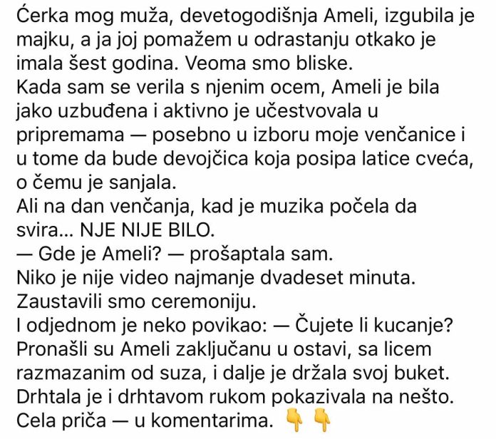 Bila je spremna. Ja sam bila spremna. Svi su bili na svojim mestima. Muzika je počela da svira. Okrenula sam se sa uzbuđenim srcem — ali Amelije nije bilo. Umesto nje, stazom je išla moja sestrićina — mala Ema. Izgledala je zbunjeno, venac joj je pao na jedno oko, a latice su skoro ispadale iz korpice. U sali je nastala neprijatna tišina. Mladoženja me je pogledao: