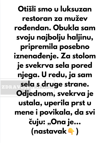 Kad smo stigli, primetila sam da je njegova mama već zauzela mesto pored njega. Nema veze — sela sam s druge strane. Ali pre nego što smo uopšte naručili, ona je ustala, pokazala prstom na mene i povikala: „Ona je tako naporna!“ Zatim je dodala: „Dajmo Luku malo odmora od toga da mu žena stalno visi za vratom!“ Zatim me je direktno pogledala, pokazala na stolicu dalje i rekla: „Pomeri se, dušo. Nek’ mama sedi sa svojim slavljenikom.“