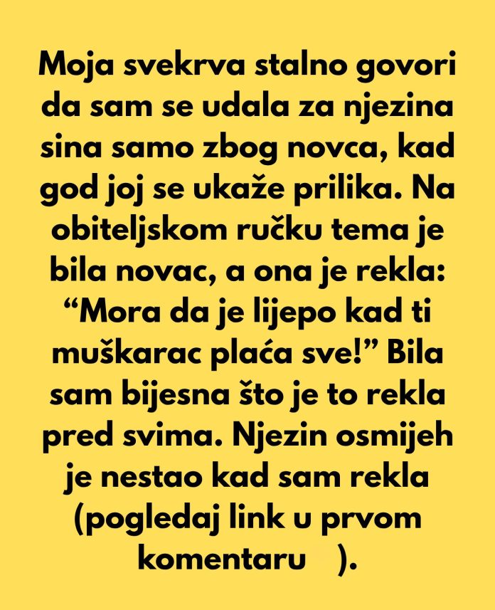 Moja svekrva stalno govori da sam se udala za njezina sina samo zbog novca, kad god joj se ukaže prilika. Na obiteljskom ručku tema je bila novac, a ona je rekla: “Mora da je lijepo kad ti muškarac plaća sve!” Bila sam bijesna što je to rekla pred svima.
