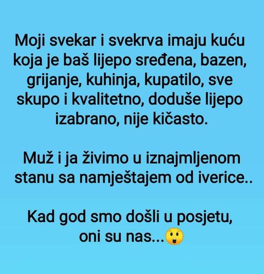 “Moji svekar i svekrva imaju kuću koja je baš lijepo sređena, bazen, grijanje, kuhinja, kupatilo, sve skupo i kvalitetno, doduše lijepo izabrano, nije kičasto.