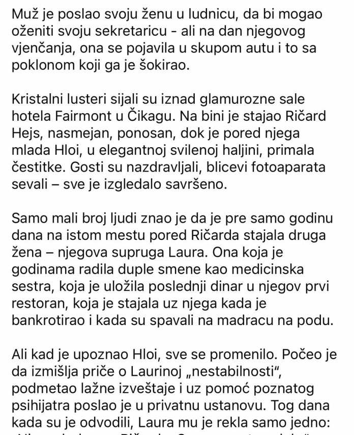Laura se nasmejala, prvi put posle mnogo meseci. „Privatna? Zanimljivo. Ovo sve ne bi ni postojalo da nije bilo mene. A znaš na šta mislim, Ričarde – na prve pozajmice koje sam uzela na svoje ime, na tvoje dugove koje sam otplatila.“Gosti su šaputali, a Karolinino lice postajalo sve bledje.„Ne veruj joj,“ prošaptao je Ričard. „Ona je bolesna.“