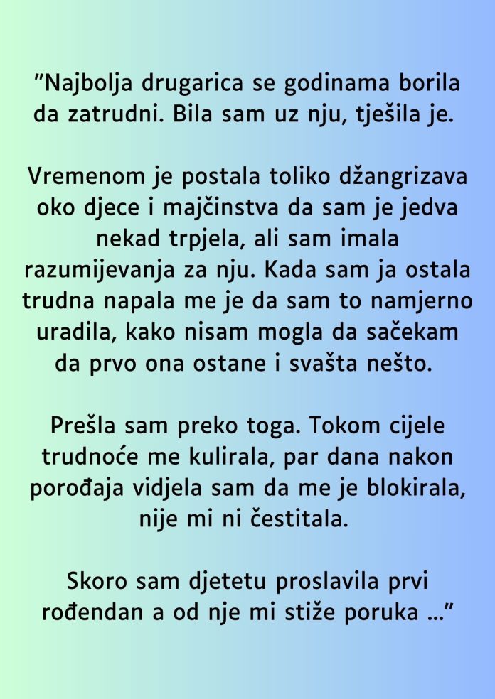 Vremenom je postala toliko džangrizava oko djece i majčinstva da sam je jedva nekad trpjela, ali sam imala razumijevanja za nju. Kada sam ja ostala trudna napala me je da sam to namjerno uradila, kako nisam mogla da sačekam da prvo ona ostane i svašta nešto.