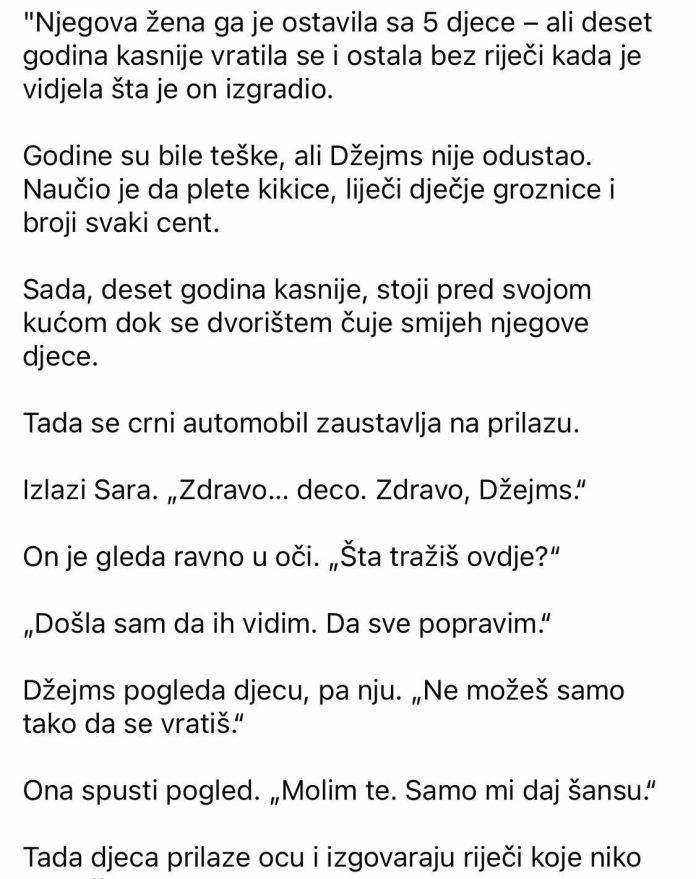 “Supruga ga je ostavila s 5 djece-10 godina kasnije vratila se i bila je šokirana kad je vidjela što je učinio.”Kišno jutro, kućica skrivena iza drvoreda. James Carter stoji u kuhinji i ulijeva žitarice u pet zdjela. Vrata se otvaraju – Sarah stoji s kovčegom u ruci.”Ne mogu to više raditi”, šapće ona.”Što ne možeš?”Pita James.