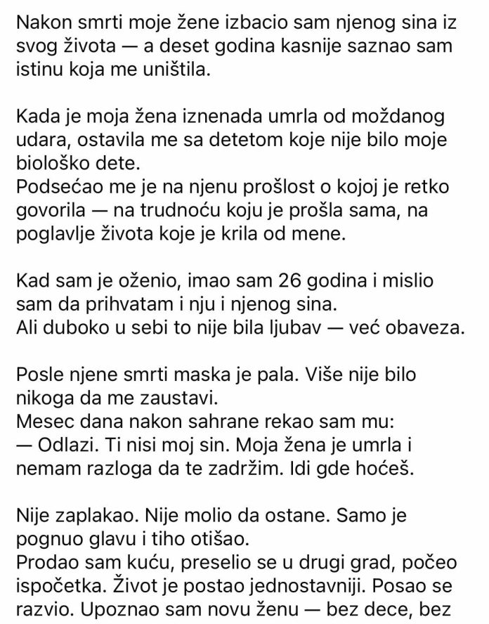 Kada sam izgubio Miru, svoju ženu, ceo svet je kao da je stao. Imala je samo trideset šest godina. Naša kuća, nekada puna svetlosti i smeha, sada je bila ispunjena tišinom i uspomenama. Tada je sa nama živeo njen dvanaestogodišnji sin, Lukas. Uvek sam ga smatrao samo njenim detetom, nikada — svojim.