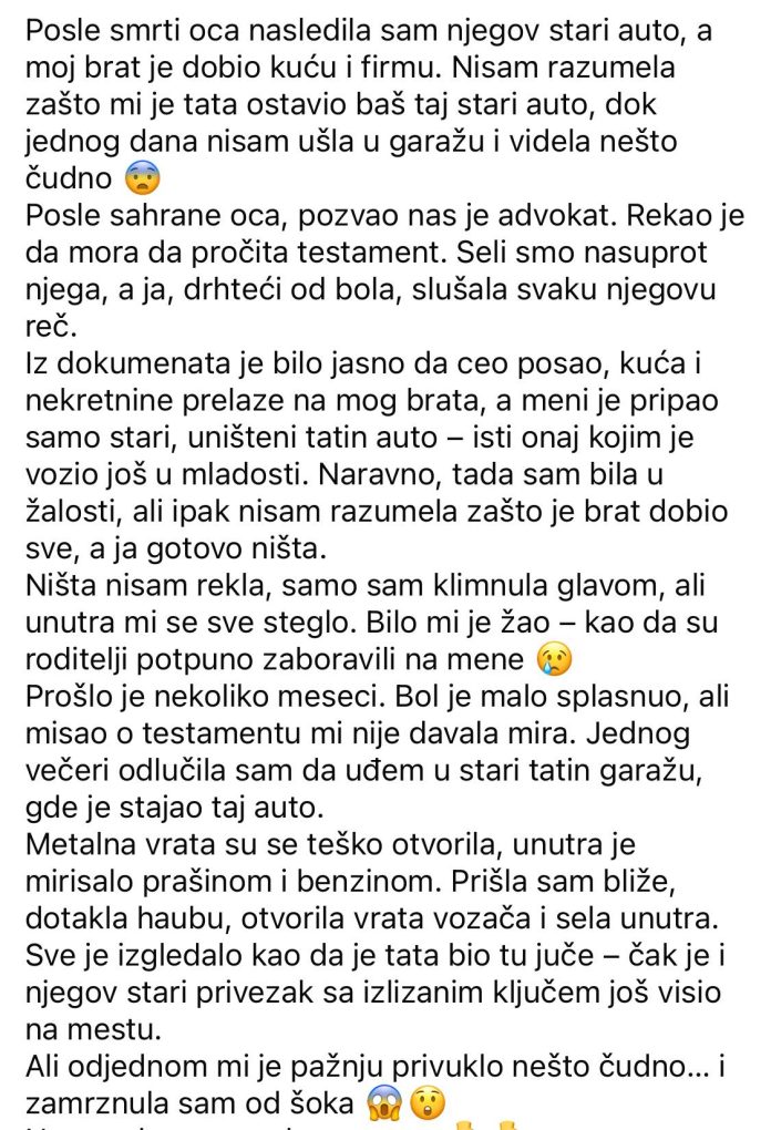Nakon smrti oca, dobila sam stari automobil, a moj brat – kuću i firmu. Nisam razumela zašto je to tako, sve dok jednog dana nisam ušla u garažu i pogledala unutra.