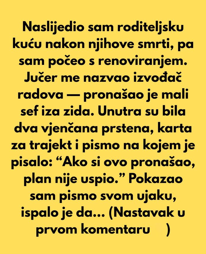 Naslijedio sam kuću svojih roditelja nakon njihove smrti, pa sam započeo s renoviranjem. Jučer me nazvao izvođač radova — pronašao je mali sef iza zida u kuhinji.