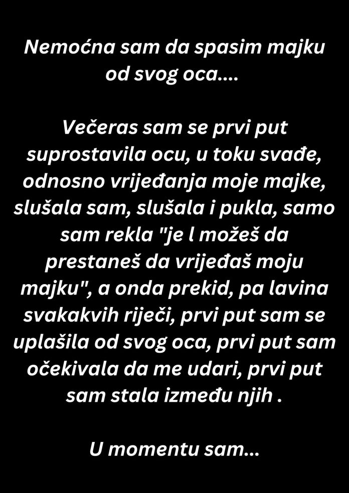 Nemoćna sam da spasim majku od svog oca…. Večeras sam se prvi put suprostavila ocu, u toku svađe, odnosno vrijeđanja moje majke, slušala sam, slušala i pukla, samo sam rekla “je l možeš da prestaneš da vrijeđaš moju majku”, a onda prekid, pa lavina svakakvih riječi, prvi put sam se uplašila od svog oca, prvi put sam očekivala da me udari, prvi put sam stala između njih .