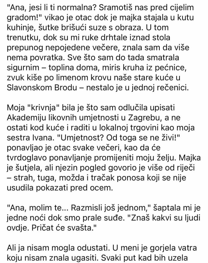 “Ana, jesi li ti normalna? Sramotiš nas pred cijelim gradom!” vikao je otac dok je majka stajala u kutu kuhinje, šutke brišući suze s obraza. U tom trenutku, dok su mi ruke drhtale iznad stola prepunog nepojedene večere, znala sam da više nema povratka. Sve što sam do tada smatrala sigurnim – toplina doma, miris kruha iz pećnice, zvuk kiše po limenom krovu naše stare kuće u Slavonskom Brodu – nestalo je u jednoj rečenici.